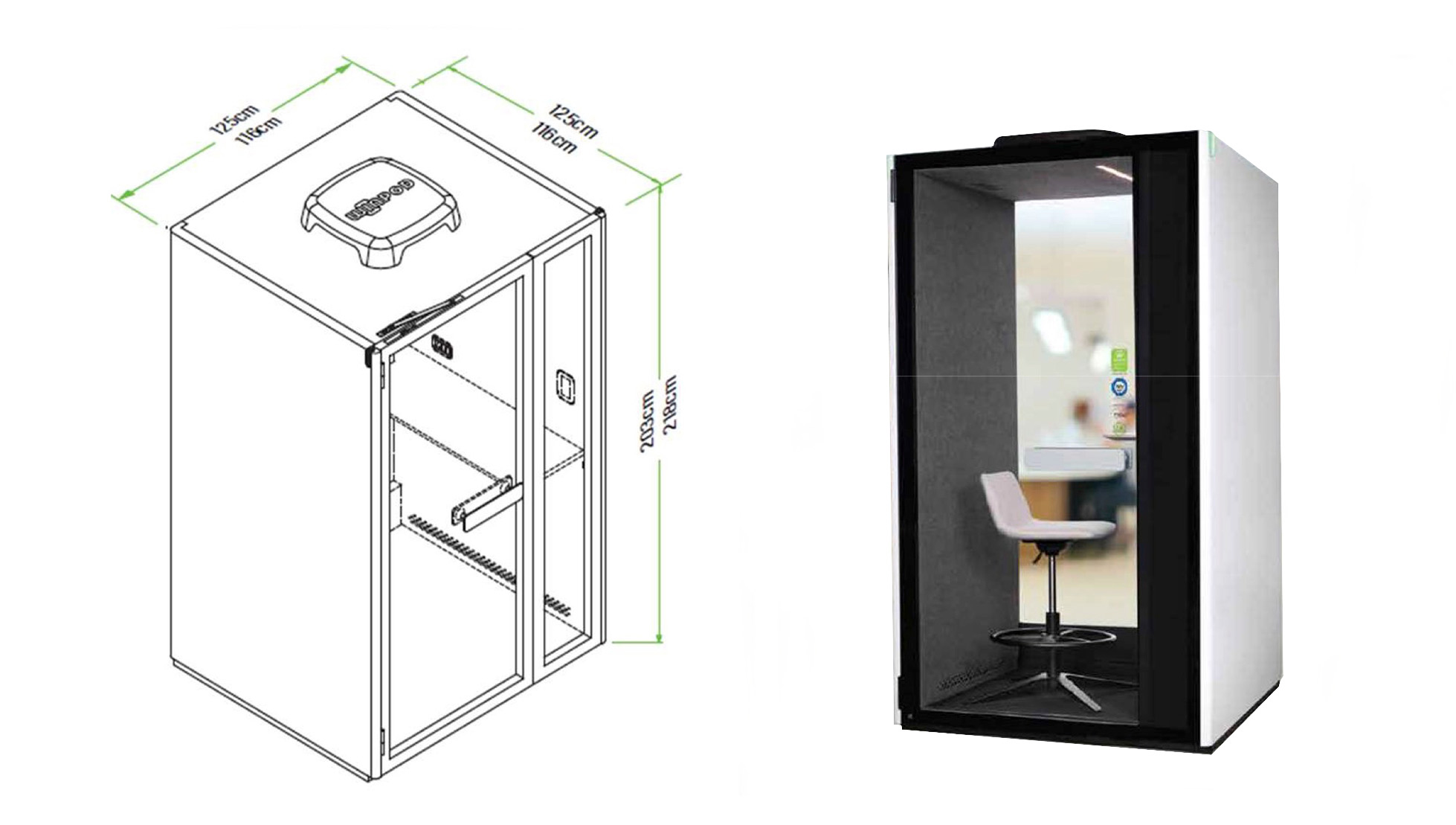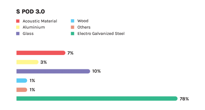 WINPOD acoustic material is composed of minimum 50% post consumer recycle PET content. WINTECH strives to create green, resilient and competitive products. Taking the manufacturing materials of S POD as an example, galvanized steel makes up 78 percent of the materials used. This can reduce the environmental burden to the planet earth and is in line with the ideal of sustainable development.